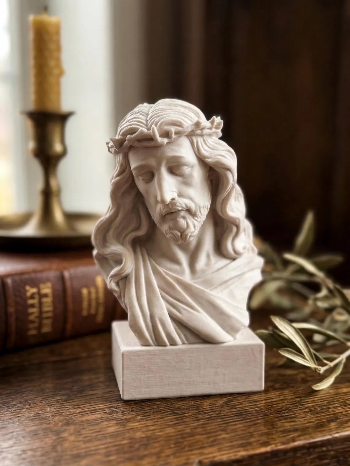 Invite the profound peace and enduring grace of Jesus Christ into your sacred space with this evocative bust featuring his iconic crown of thorns and a quiet, contemplative gaze. This piece honors his ultimate sacrifice and teachings of radical love—a potent symbol for anyone walking the path of faith, seeking solace during difficult seasons, or honoring the Divine in their daily life.
