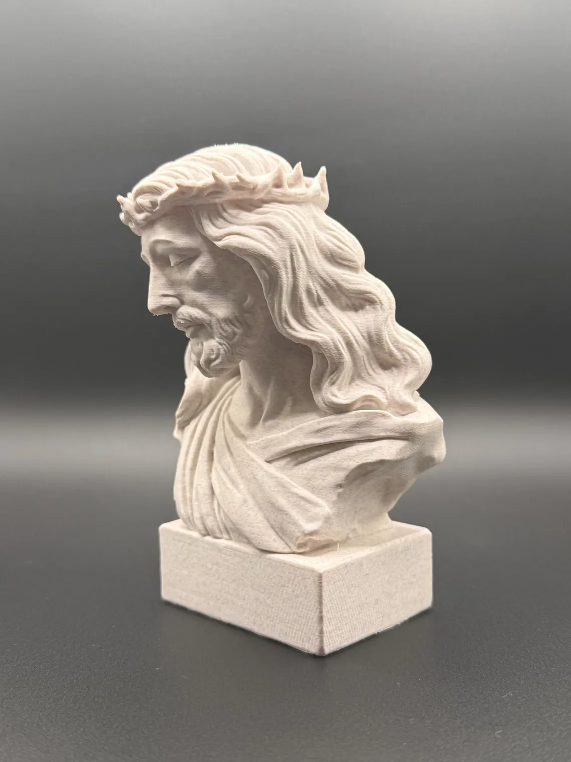 Finely detailed 3D-printed bust capturing the woven crown of thorns, flowing hair, and draped garments