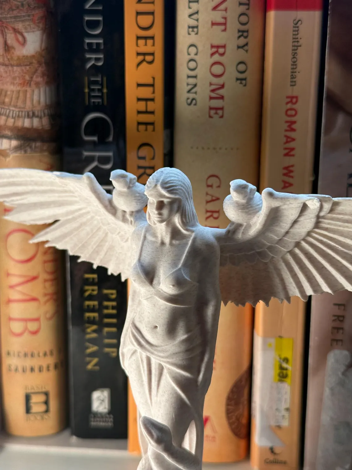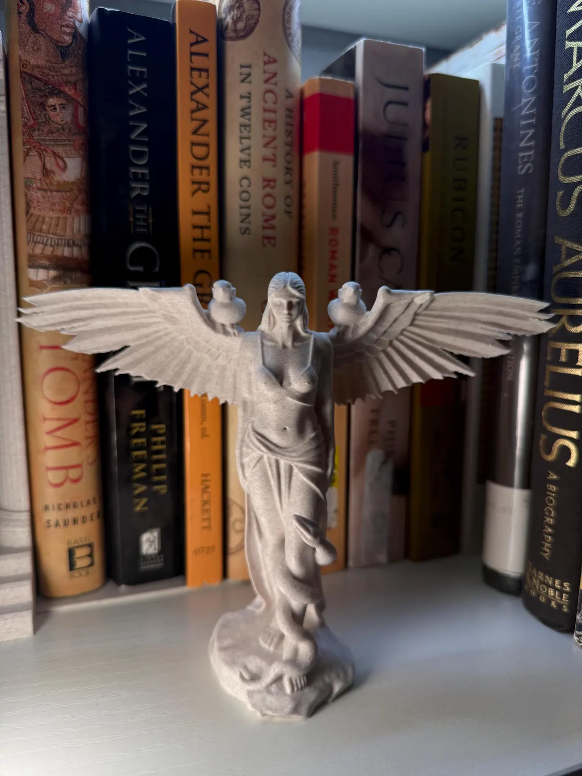 Intricate Detail: High-resolution 3D print captures the texture of the feathers and the flow of the drapery.